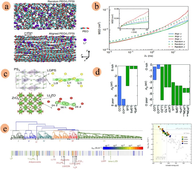 使用基于第一原理密度泛函理论(DFT)计算的方法,对固态电解质中的离子传输机制进行了原子级别的能量计算,并得出了一些重要结论。借助综合材料数据库,第一原理研究得到了极大的推动,可以预测新材料的性质。通过第一原理研究,还可以探究电极和一些常见SSEs之间界面的化学和电化学稳定性的热力学性质。这些基于第一原理的研究为我们深入了解SSEs的离子传输机制以及界面的化学和电化学稳定性提供了重要的信息。分子动力学(MD)模拟是一种计算模拟技术,用于评估原子和分子的物理运动和动态演化过程。在研究锂离子传输机制方面,MD模拟被广泛应用。这种模拟技术能够提供原子和分子级别的动态信息,帮助解释实验观察结果,并深入理解离子传输机制。AIMD模拟是一种化学上的不可知性模拟方法,比MD模拟更适合用于预测新的固态电解质(SSEs)材料。AIMD模拟可以对材料中所有离子的实时动力学进行建模,从而可以确定离子扩散机制中的迁移路径等重要信息。利用AIMD模拟澄清了离子扩散的原子级机制,并量化了快速离子导体的扩散特性。AIMD模拟计算出的锂离子电导率、离子传导和活化能与实验结果相一致。此外,AIMD模拟还可以直接观察到离子动力学,帮助理解离子跳跃机制和扩散途径。通过大规模的AIMD模拟,可以研究界面失效的基础原子过程和界面结构。这些模拟可以揭示施加压力和界面附着能对锂电池界面性能的影响,并帮助选择最佳的固态电池设计。机器学习(ML)作为AI的一个特定子集,通过使用数据进行训练,已经被应用于能源储存和转换设备领域,尤其是锂电池。通过在基于ML的模型的指导下进行传统的DFT-MD模拟,可以评估超?2,000种不同结构和成分的候选者,以寻找新的固体锂离子导体。目前大多数基于ML技术的SSEs研究都集中在纯无机陶瓷上,较少有研究人员使用ML技术来研究复合电解质。相比无法覆盖整个组合空间的DFT-MD筛选,ML策略可以用于探索更广泛的组合、/p>