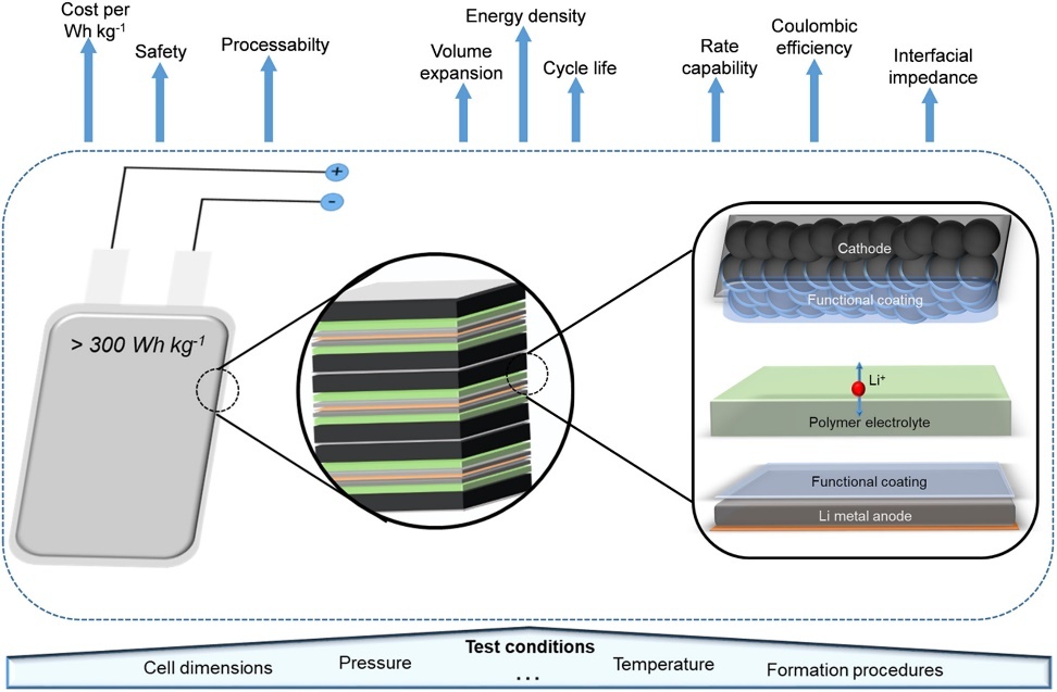 将学术电池外推到多层软包电池深刻地证明了实际基准的重要性:即便优化了薄膜厚度,也需要在实现更高的正极质量负载和可逆放电容量方面取得进展,以满足工业需求。与基于传输特性(例如离子电导率)和性能特性(例如放电容量)的系统进行传统评估不同,提出了一种新的指标,该指标表示每个周期的平均可访问能量。该指标包括正极质量负载和工作电压,并显示了系统在更大规模下被考虑的潜力。与无机固体或液体电解质进行复合是有效的方法,聚合物可以兼顾柔性和机械坚固或者可以分别稳定正负极和界面、/p>