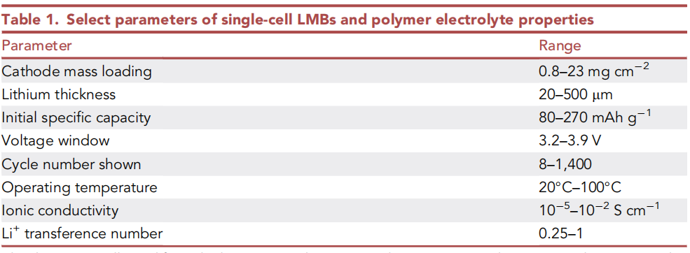 除了比能量的预测之外,电化学性能的评估对于推进基于聚合物的LMBs至关重要。电池性能不仅取决于外部实验条件,还取决于电池的设计,包括正极的质量负载和锂金属负极的厚度以及电解质和活性材料的比例。表1说明了已发表的基于聚合物的LMB研究中采用的各种电池设计,测试参数和聚合物特性。在报告的研究中,聚合物电解质的离子电导率和转移数也变化极大,从而对电池功率和性能产生重大影响、/p>