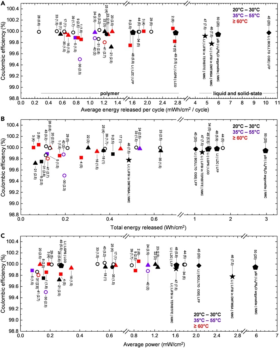 ?A将报告的平均 CE 与具有各种类型电解质 LMB 中每个周期释放的平均能量进行比较,并比较了图5B中发现的CE和总能量(释放?循环次数的平均能量)以及平均功率(图 5C)。含有液?固态电解质的参比大多数聚合物体系显示出更高的功率密度,这可能表明它们具有更高的充电/放电速率的能力。由于涉及多个变量,可能需要进行更多的研究来阐明具体的功率趋势。其中有几点需要关注的?.更高的正极质量负载;2.堆叠压力很重要;3.安全性和可持续性、/p>