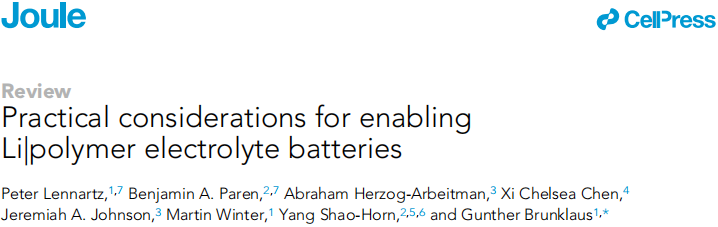 Peter Lennartz, Benjamin A. Paren, Abraham Herzog-Arbeitman, Xi Chelsea Chen, Jeremiah A. Johnson, Martin Winter, Yang Shao-Horn, Gunther Brunklaus, Practical considerations for enabling Li|polymer electrolyte batteries, Joule, Volume 7, Issue 7, 2023, Pages 1471-1495, ISSN 2542-4351.