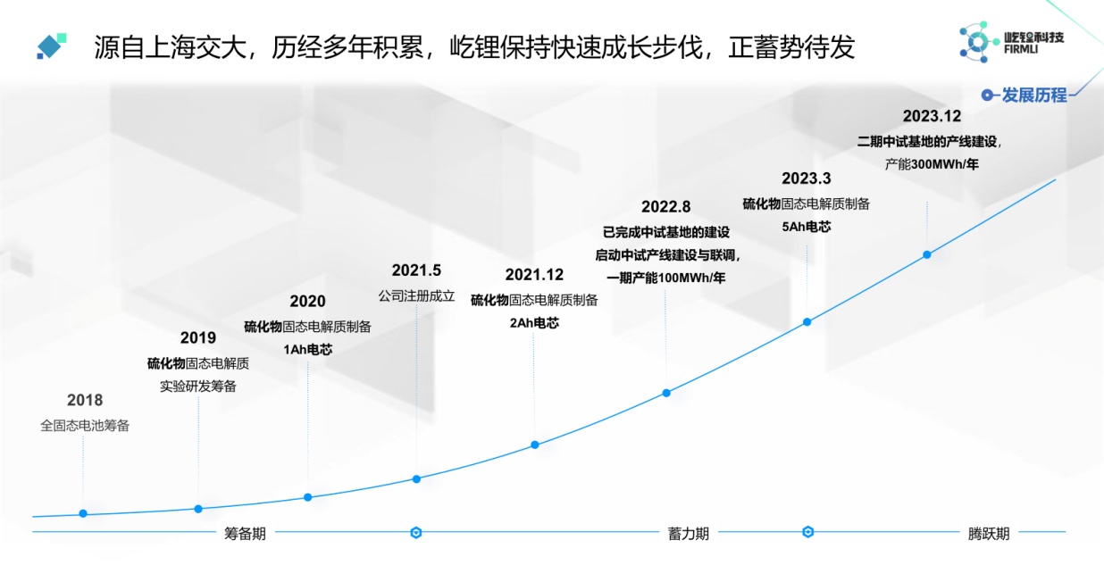 屹锂科技一直专注研究硫化物全固态电池核心技术突破与规模生产,是全球领先的硫化物固态锂电池供应单位。上海交通大学张希教授从2018年开始进行全固态电池筹备;2019年对硫化物固态电解质进行筹备?020年利用硫化物固态电解质制备出了1Ah电芯?021年成立上海屹锂新能源科技有限公司,并利用硫化物固态电解质制备出了2Ah电芯?022年在上海临港新片区建成硫化物全固态电池的研发及中试基地,启动了中试产线建设与联调,一期产?0MWh/年,并利用硫化物固态电解质制备出了5Ah电芯?023年完成了二期中试基地的产线建设,产能150MWh/年、/p>