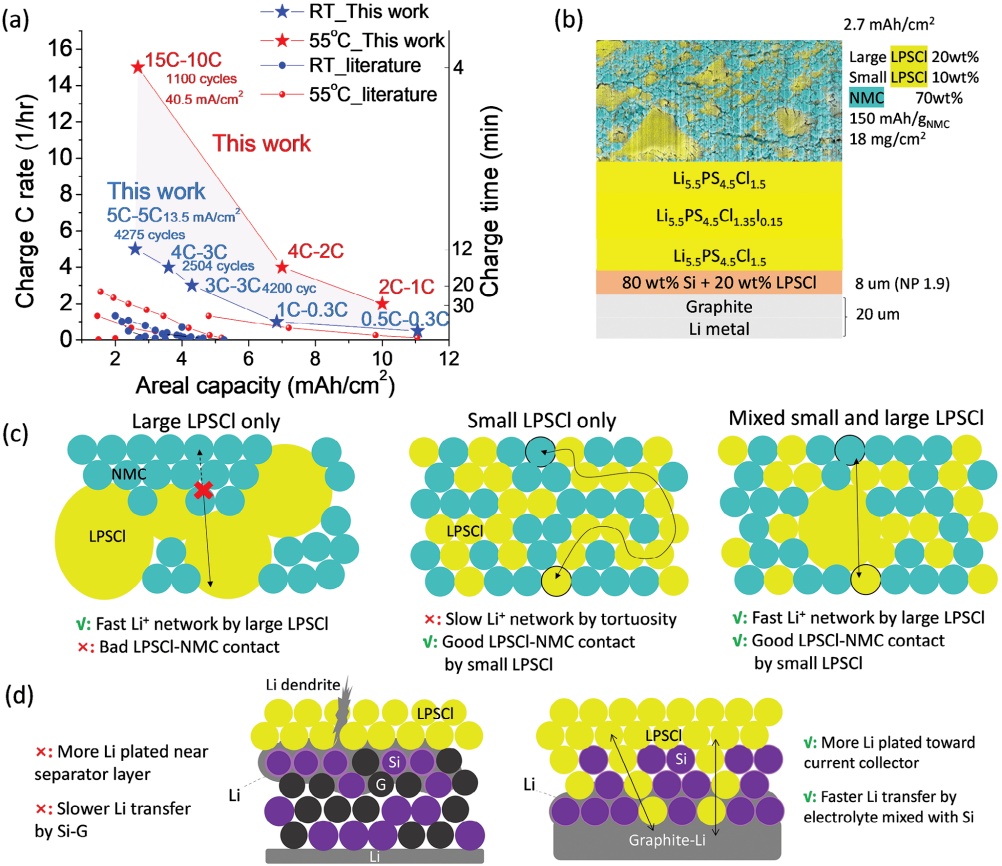 此工作中的全电池在高面容量下?gt;2 mAh cm-2)的高倍率性能相比同类型的硫化物电池有质的飞跃。正极电解质采用了大小颗粒混合的策略,以同时保证锂离子以低曲折度快速穿越厚电极,以及良好的活性材料NMC与电解质的接触。负极方面改良了硅碳|锂金属复合物结构,用微米硅与LPSCl电解质混合,使得锂离子可以快速充分均匀地抵达硅颗粒的表面,以及快速通过电解质传导到负极靠近锂金属一侧、/p>