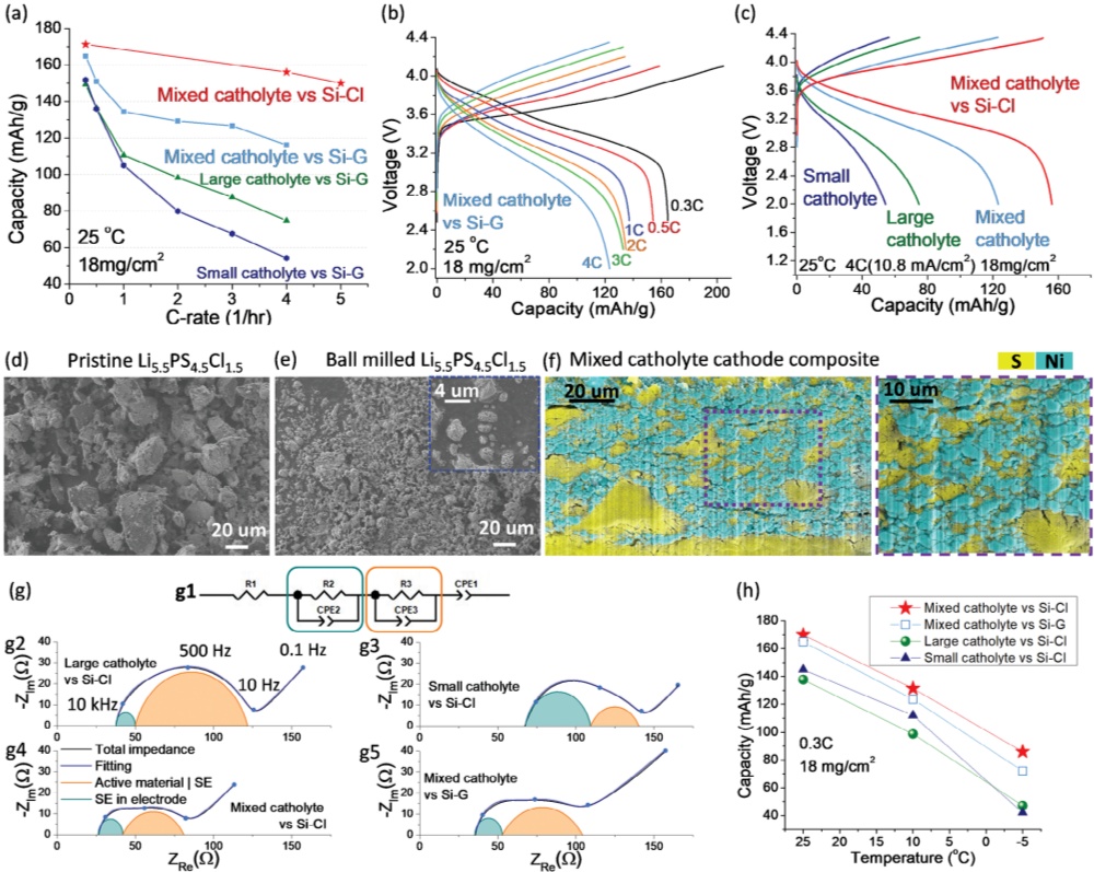 在正极处,相比于单独采用大颗粒或小颗粒的电解质,大小混合的条件下高倍率容量有明显提升,采用改良的Si-Cl负极可以使高倍率容量更进一步。在电子显微镜FIB-SEM-EDS表征下可以看到大颗粒电解质处在电极各处以快速纵向疏通锂离子,而小颗粒电解质可与活性材料充分接触并传递锂离子。电化学阻抗谱可以被分解为两个明显的半圆,高频的半圆代表锂离子在电极复合物的电解质网络中传输的阻抗,低频的代表锂离子穿越电解?活性物质的界面阻抗。大颗粒和小颗粒分别可以明显降低电解质网络的传输阻抗和界面阻抗,而大小混合后可以有效同时降低两者、/p>