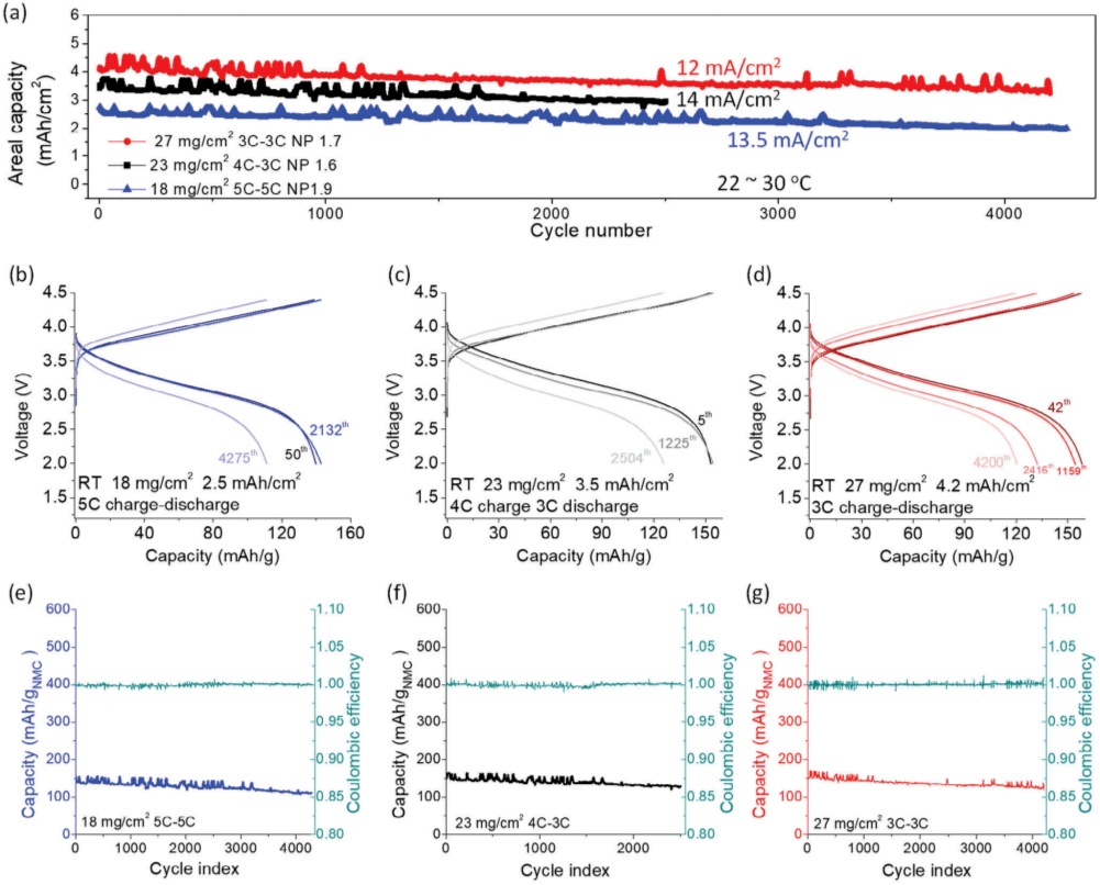 通过以上的电极结构设计,全固态电池在室温下达到了2.5 mAh cm-2以上3-5C倍率的长循环。得益于该动力学设计,正极的比容量在室温下达到了~150 mAh g-1的高正极利用率、/p>