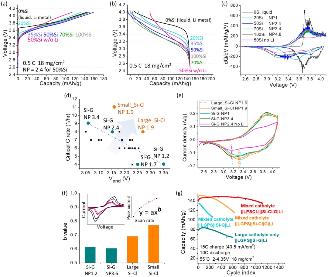 ?a-c是以?石墨|锂金属(Si-G|Li)为负极的充放电电压曲线与dQ/dV分析,从中得出放电曲线终点附近的拐点电压与基于硅负极容量计算的名义上的NP值成负相关。在测量了不同NP值,以及相同NP值下不同元素与硅混合后的临界短路倍率(C-rate)之后,我们发现了临界短路C-rate?.3C拐点电压的负相关关系(图4d)。从电池性能的角度来说,两者都是越高越好。而Si-Cl负极可以突破原有的负相关区域,同时达到高的临界短路C-rate和电压(?d,e)。在动力学指标b值的测量中,Si-Cl负极相对于Si-G负极有显著提升、/p>