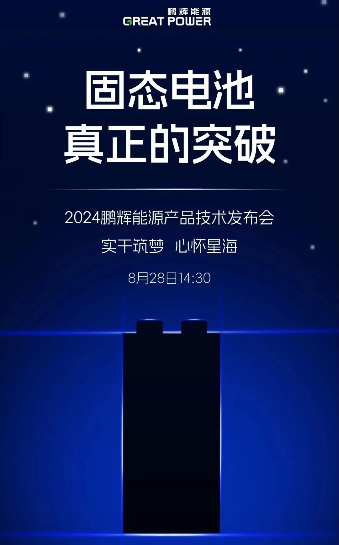 中国粉体网讯8?1日鹏辉能源官微发布消息,公司全固态电池取得重大突破!将于8?8日进行?024鹏辉能源产品技术发布会”,并带来全固态电池实物首秀、br/>