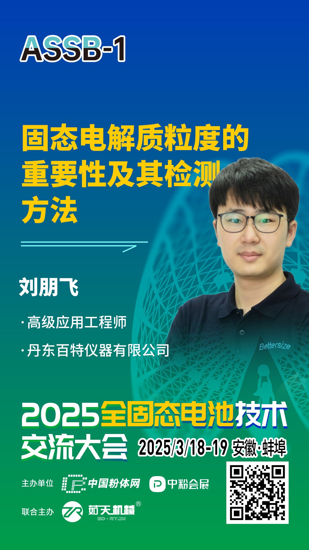针对固态电池相关的技术、材料、市场及产业等方面的问题+span style="color: rgb(255, 192, 0);">中国粉体罐/strong>将于2025??8-19?/strong>?span style="color: rgb(255, 192, 0);">安徽·蚌埠举办2025全固态电池技术交流大会暨第一届干法电极技术研讨会。为致力于固态电池技术开发的企业,科研院校,以及新能源汽车、储能、消费电子等终端企业提供信息交流的平台,开展产、学、研合作,助推固态电池产业化发展。届时,丹东百特仪器有限公司高级应用工程师刘朋飞将作题为《固态电解质粒度的重要性及其检测方法《/strong>的报告。报告重点介绍激光衍射法在硫化物、氧化物等固态电解质粒度分析中的应用、/p>