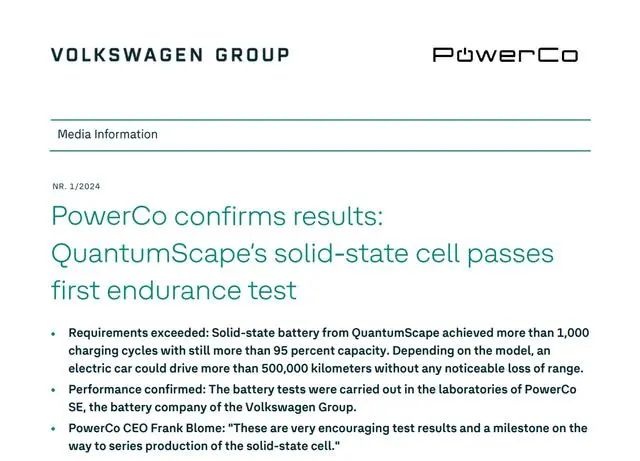 2024?月,大众集团子公司PowerCo的发布公告称,PowerCo通过亲手实验证实,QuantumScape的无负极固态电池样本,能够做到充放?000次,且在测试完成时电池“几乎没有老化”,仍保?5%的容量(放电能量保持率)、/p>