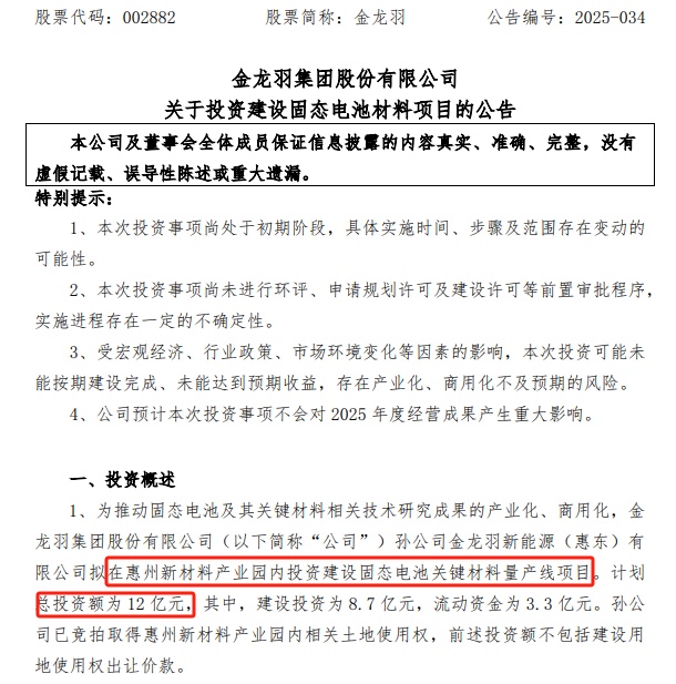中国粉体网讯4?日,金龙羽集团股份有限公司(简称:金龙羽)发布公告称,其孙公司金龙羽新能源(惠东)有限公司拟在惠州新材料产业园内投资建设固态电池关键材料量产线项目、br/>