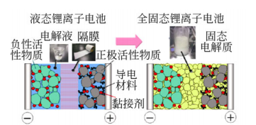 传统液态锂离子电池与全固态锂离子电池示意国/p>