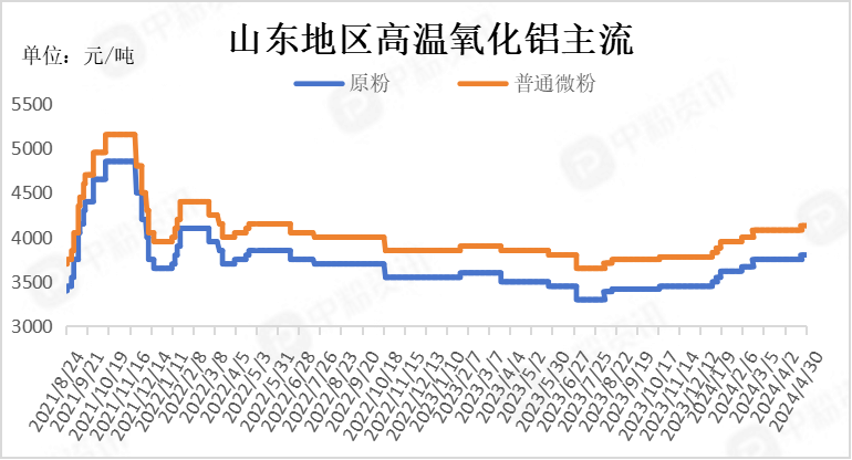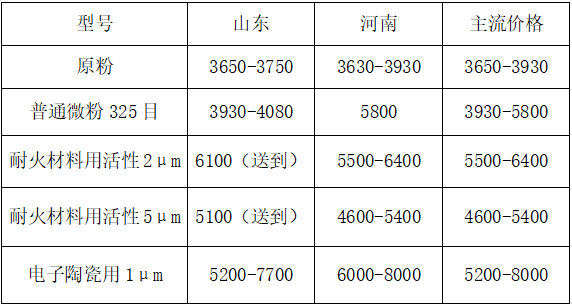 市场概述9/span>四月初,高温煅烧氧化铝市场走势弱稳,交投氛围一般。四月下旬,高温煅烧氧化铝价格走势偏强,需求量日益剧增,供不应求的局面开始出现。据了解,山东市场涨?0?吨,区域内煅烧原粉主流价格上?0元至3650---3750?吨,普通煅?25目微粉主流价格上调至3930---4080?吨。河南地区煅烧原粉主流出厂价格在3630---3930?吨,普通煅?25目微粉主流出厂价?800?吨,5μm煅烧微粉主流出厂价格维持?600---5400?吨,2μm活性氧化铝主流出厂价格?500----6400?吨、/span>