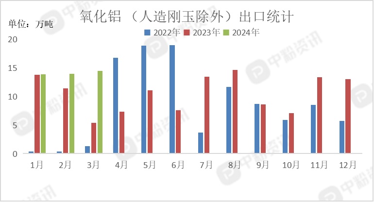 出口9/span>海关统计?024?月我国氧化铝(人造刚玉除外)当月出口量为14.41万吨,累计出口量?2.16万吨,出口量环比上涨3.52%,出口量同比上涨169.35%,累计出口量比去年同期上?8.09%、/span>