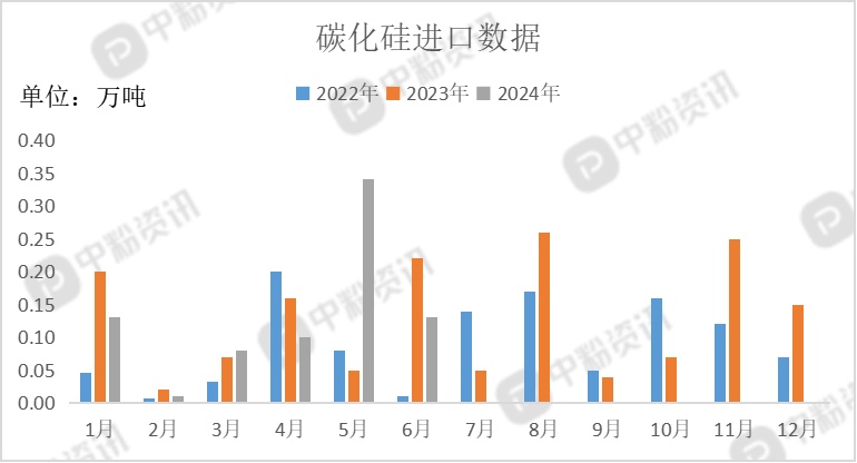 进出口市场:进口方面,海关统计,海关统计?024?月我国碳化硅当月进口量为0.13万吨,累计进口量?.78万吨,进口量环比下降62.00%,进口量同比下降41.00%,累计进口量比去年同期上?0.00%、/span>