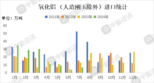 进口9/span>海关统计?024?月我国氧化铝当月进口量为7.07万吨,累计进口量?25.56万吨,进口量环比上涨87.53%,进口量同比下降45.32%,累计进口量比去年同期上?1.29%、/span>