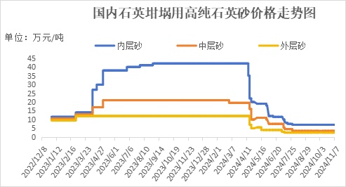 市场概述9/span>本周,国内高纯石英砂市场整体运行态势持稳,暂未发现有大幅波动迹象。其中光伏坩埚用高纯石英砂市场需求未见有明显起色,国内市场开工率处于较低水平,海外市场供应量稳定、/span>光伏行业的大规模投资和新建扩建项目导致上下游产能急剧增加+/span>而市场需求并没有同步增长,短期内产能过剩,导致阶段性供需失衡。近期下游坩埚企业订单寥寥,价格有下跌趋势,预计年前市场好转可能性不大、/span>国内半导体用高纯石英砂市场态势呈现较为稳定的状态,市场供需格局依旧趋紧。目前全球可以量产的满足半导体行业需求的高纯石英砂企业数量不多,行业具有较高的技术壁垒。光纤用高纯石英砂市场供需基本维持平衡,目前国内的基础产品基本可以满足需求,但较为高端的光纤预制棒用高纯石英砂纯度要求较高,还是要依赖于国外进口。光学、光源用高纯石英砂市场运行稍显弱势,市场商谈氛围一般,下游企业多以刚需采买为主,基础市场发展前景较弱、/span>