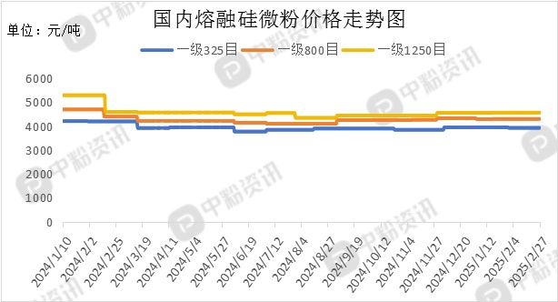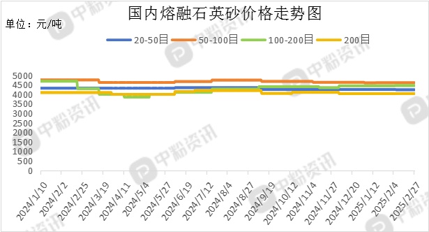 市场概述9/span>2月份+/span>国内熔融石英市场整体运行态势保持平稳,价格方面未见明显波动,订单情况良好,企业开工基本已恢复至年前水平,供需基本维持平衡。下游方面,耐火材料市场表现不及预期,需求较为弱势,覆铜板需求稳步提升,产销量同步增长,而在高端半导体领域的应用仍保持稳宙/span>、/span>截至目前,国内熔融石英砂主流目数市场均价分别为?0-50?SiO2:99.7%-99.9%)均价?950-4550?吨;50-100?SiO2:99.9%-99.97%;)均价?500-4900?吨;100-200?SiO2:99.9%-99.98%;)均价?000-4700?吨;200?SiO2:99.7%-99.9%;Fe2O3?.008%;Al2O3?.05%;)均价?800-4300?吨左右。国内熔融硅微粉主流目数均价分别为:一?25?SiO2?9.96%;Fe2O3?0PPM;)均价?500-4050?吨;一?00?SiO2?9.96%;Fe2O3?0PPM;)均价?000-4600?吨;一?250?SiO2?9.96%;Fe2O3?0PPM;)均价?450?吨左右。(所有数据截??7日)