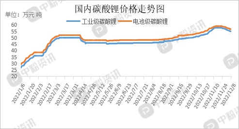 市场综述9/span>本周,国内碳酸锂市场价格不断回落,目前工业级碳酸锂主流出厂价格降臲/span>55-55.5万元/吨,电池级碳酸锂主流出厂价格?5.5-57.5万元/吨,下游采购积极性回落,买涨不买跌心态下,下游需求市场目前持续观望状态。其中,动力电池企业前期备货积极,库存增加明显,当前以消化原料库存为主,采购积极性减弱。资源端供给仍紧俏,锂精矿进口价格不断升高,加之盐湖卤水处于减产阶段,供应方面依然对基础锂盐价格具有一定支撑。企业方面,国内企业生产相对正常,主流大厂基本以长约订单为主,暂不签订散单,现货市场仍然是货源紧缺状态、/span>2022年是新能源汽车补贴的最后一年,没有了政策加持,预计2023年开年终端消费会有所回落。结合当前不断回落的价格来看,预计短期内现货市场仍维持不温不火的交投状态,下游观望。(所有数据截?2?日)