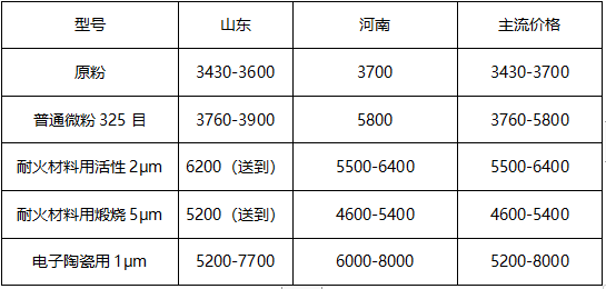 价格9/span>目前暂未有调整,当前山东地区原粉主流出厂报价?430-3600?吨,普通煅?25目微粉主流出厂价格在3760-3900?吨;河南地区煅烧原粉主流出厂价格?700?吨,5μm煅烧微粉主流出厂价格维持?600-5400?吨,2μm活性氧化铝主流出厂价格?500-6400?吨。(所有数据截??6日)