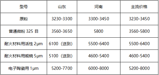 价格9/span>主产区山东地区煅烧原粉主流出厂报价在3230-3300?吨,普通微粉价格在3560-3650?吨,电子陶瓷?μm氧化铝价格在6000-8000?吨;河南地区煅烧原粉主流出厂价格?300-3450?吨,5μm煅烧微粉主流出厂价格维持?600-5400?吨,2μm活性氧化铝主流出厂价格?500-6400?吨。(所有数据截??3日)