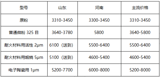 价格9/span>主产区山东地区煅烧原粉主流出厂报价在3310-3450?吨,普通微粉价格在3640-3780??/span>,电子陶瓷用1μm氧化铝价格在6000-8000?吨;河南地区煅烧原粉主流出厂价格?/span>3300-3450?吨,5μm煅烧微粉主流出厂价格维持?600-5400?吨,2μm活性氧化铝主流出厂价格?500-6400?吨。(所有数据截?1?3日)
