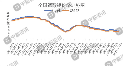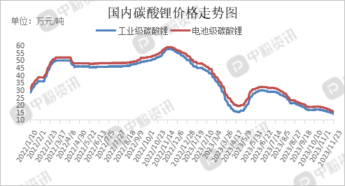 上游市场行情9/span>本周,国内碳酸锂市场持续走弱,价格仍呈下行趋势,下游采购意愿较差,散单成交价格持续松动。据了解,目前,工业级碳酸锂主流出厂报价降至13.84万元/吨左右,电池级碳酸锂主流市场价格?5.19万元/吨左右。行业竞争加剧,终端消费难有较明显的提升,碳酸锂行业当前供需双方博弈僵持,预计短期内现货市场难有明显改观,碳酸锂市场价格维持当前弱稳下行现状、/span>(所有数据截臲/span>11?3日)