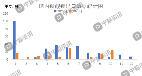 海关统计+/span>2023?0月我国锰酸锂当月出口量为24.22吨,累计出口量为122.28吨,出口量环比上?9.95%,出口量同比上涨248.36%,累计出口量比去年同期下?6.77%、/span>