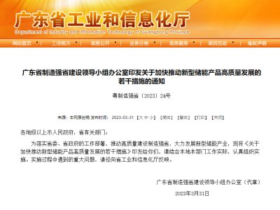 3?1日,广东省制造强省建设领导小组办公室印发《关于加快推动新型储能产品高质量发展的若干措施的通知《/p>2023?4?6?nbsp;更新
