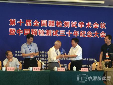 邱副市长向胡荣泽教授颁发“中国颗粒测试三十周年特殊贡献奖“br />