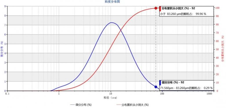 粒径微分分布曲线(蓝色)可以直观地获取颗粒粒径集中区域和离散区域的颗粒的粒径信息,如上图所示,可以轻易的看到当前曲线对应样品的主要颗粒集中?0μm左右(中间粒径),少量的大颗粒接?00μm,少量小颗粒的尺寸做1μm左右(边界粒径)。有时候我们也用微分曲线来察看颗粒分布丰度最高的粒径、/span>