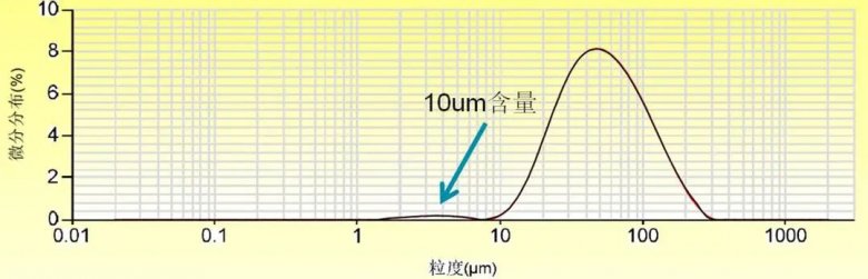 粒径分布累积曲线(红色)可以用来做坐标图中直接读数,例如我们查看10μm横坐标处的纵坐标(右轴)值为52.2%, 意味着当前样品中小?0μm的颗粒总量占整体样品的比例?2.2%,科学地表述?0μm累积含量=52.2%. 同时,我们也可以以纵坐标,例如累?0%的位置,查找横轴的粒径值为3.1μm,意味着当前样品中小?.1μm的颗粒总量占整体样品的比例?0%,亦即累积分布至10%处的颗粒粒径?.1μm,科学地表述为D10=3.1μm、/span>