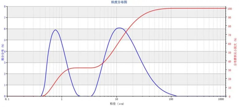 通常,颗粒的尺寸被称作粒径或颗粒直径,颗粒群体的在不同粒径上的含量分布被称作粒度。激光粒度仪正是利用光散射现象对与粒径相关的颗粒散射光能分布(散射光角度分布)进行测量,通过米氏散射理论将光能分布反演计算出与光能分布相匹配的颗粒粒径分布。典型的,粒度可通过粒度曲线或图表来进行查看。将颗粒粒径不同尺寸上的含量以微分分布曲线(下图蓝色)显示;将颗粒从最小到特定粒径的累积含量以累积曲线(下图红色)显示。罕见的,累积曲线也以从大到小的方向进行,本文仅就从小到大的累积进行说明、/span>