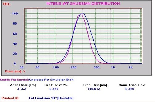 ?/span>NICOMP 380咋/span>Accusizer 780 APS分别测试稳定的脂肪乳丙泊酚成?/span>A和不稳定的脂肪乳B (油相20%)。图2和图3?/span>NICOMP 380检测丙泊酚平均粒径分布。图4和图5丹/span>AccuSizer 780APS全自动颗粒计数分析仪测试分析该两份丙泊酚样品的尾端分布、/span>