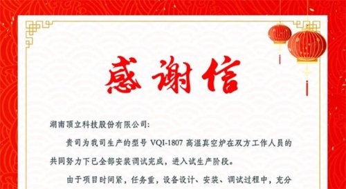 近日,顶立科技碳陶事业部收到了湖北菲利华石英玻璃股份有限公司的感谢信。“贵司工作人员夏智喜、徐奎、杨权等工程师技术能力过硬,安装、调试细致认真、尽职尽责,可以急客户所需,确保了该类设备在预定时间内进行试生产,保证了我公司产品