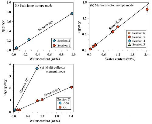 ?:三种水含量和H同位素分析模式的水含量校正曲线。(a)跳峰同位素模式;(b)多接收同位素模式;(c)多接收元素模式、/b>