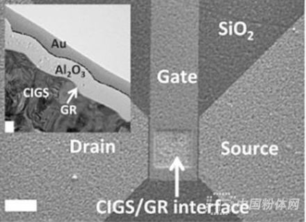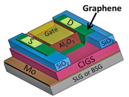 在该研究中所使用的石墨烯场效晶体管机制示意图。该组件由太阳能电池(包括堆栈于高性能CIGS半导体顶部的石墨?组成,再堆栈于钠钙玻璃、SLG或BSG等材料的基板三br /> Source:Brookhaven National Laboratory