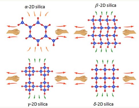 董校博士认为,SiO2的负泊松比是由于其三维的结构化学规律在低维条件下被破坏造成的。即证明这三种新型的二维SiO2材料的负泊松比来源是低维效应。在三维空间中,晶体结构遵循结构化学定律 鲍林定律。然而,在低维如二维空间中,这些定律将不再适用。低维系统中独有的原子排列方式将会给材料带来新颖的性质,这种性质是三维系统中很难看到的。该工作中的二维氧化硅的平面负泊松比来源于特殊的晶格结构对称性与硅氧四面体在低维系统下的耦合造成的,也就是说,二维氧化硅材料的平面负泊松比是由低维效应造成的、/p>