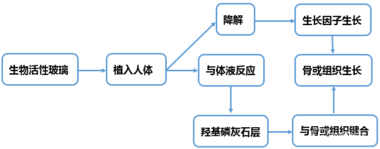 生物活性玻璃之所以拥有活性,最主要的原因是生物活性玻璃器官或组织植入人体后与人体体液发生反应,在表面生成碳酸羟基磷灰石结构层,经过一段时间的反应,碳酸羟基磷灰石晶相支架层形成,它具有较大的表面积且表面带有负电荷,适合吸附大量的生物分子,为组织提供了键合界面,因此羟基磷灰石晶相层成为新组织生长的基床。细胞在生物活性玻璃表面快速增殖与分化,最终与周同组织相融合、/p>