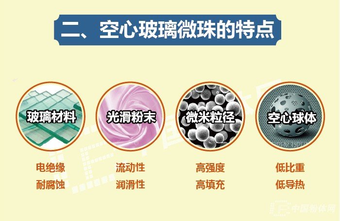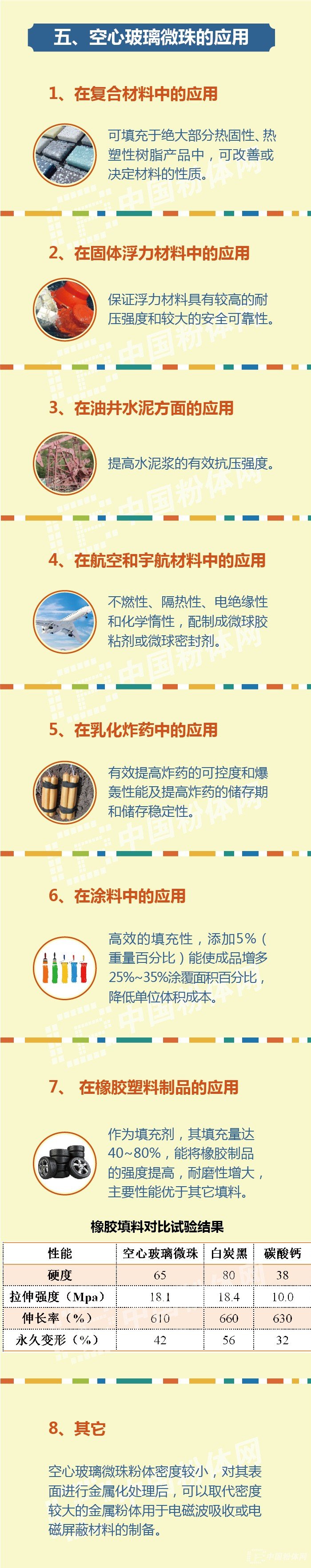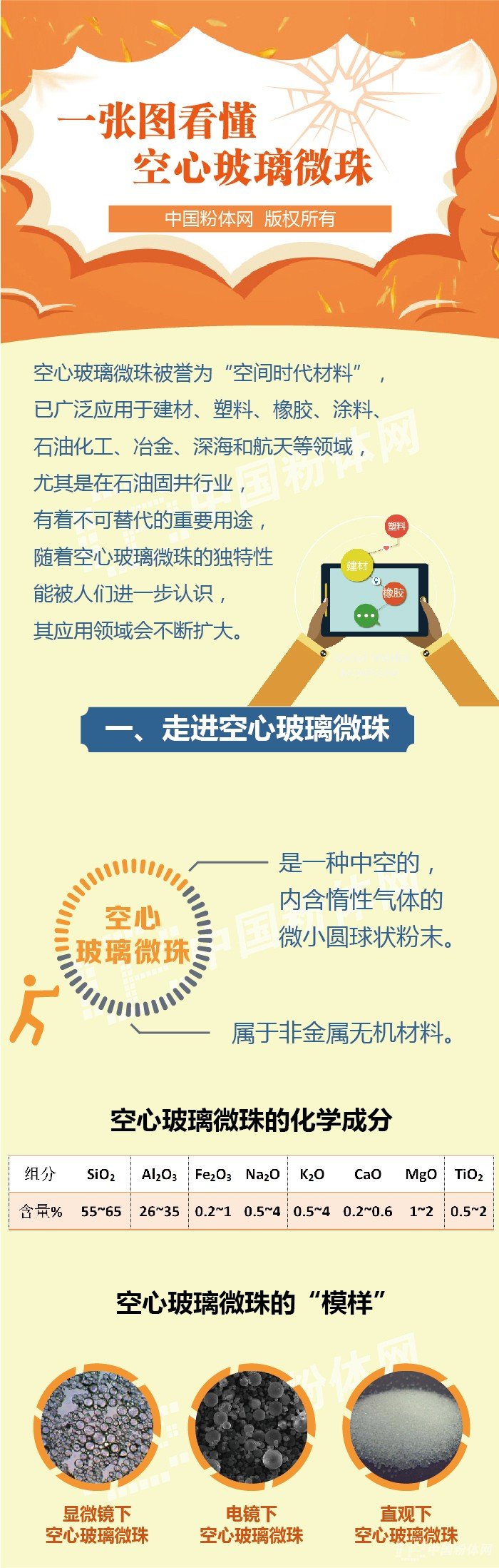 空心玻璃微珠是一种中空的,内含惰性气体的微小圆球状粉末,它属于非金属无机材料,被誉为“空间时代材料”,已广泛应用于建材、塑料、橡胶、涂料、石油化工、冶金、深海和航天等领域,尤其是在石油固井行业,有着不可替代的重要用途,并随着空心玻璃微珠的独特性能被人们进一步认识,其应用领域会不断扩大、br/>