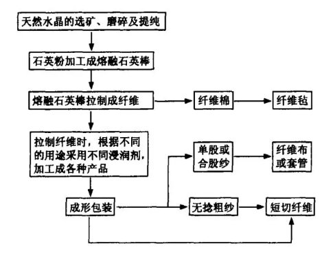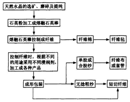 石英玻璃纤维一般是由纯的天然水晶提炼加工成熔融石英玻璃棒拉制而成。在拉制过程?加热的方式有氢氧火焰法和等离子体?根据用途的不同,涂覆相应的浸润剂。石英玻璃纤维的产品有直接无捻粗纱、有捻纱(包括单股和合股纱)、纤维布、纤维套管、短切纤维、纤维棉、纤维毡和纤维砖等。石英玻璃纤维各种产品的生产工艺流程如下: