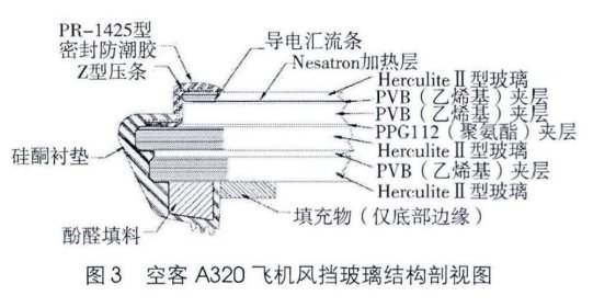 风挡玻璃从使用角度考虑除了具有应有的光学特性外,还应具有足够的结构强度和刚度,较长的使用寿命,抗鸟撞击以及防冰霜等方面的功能。运输类飞机在发展早期曾采用单层无机玻璃作风挡玻璃,但存在脆性大、抗冲击性能差等缺陷。为提高飞机风挡玻璃的抗鸟撞击能力和使用安全性,风挡玻璃选用层合结构形式,其结构形式由单层无机玻璃改为三层或多层无机玻璃复合结构形式。复合结构风挡玻璃由外层玻璃、中层玻璃、内层玻璃、中间胶合层、加温系统及密封材料等组成,具体如图2所示。空客A320(此次事件中的飞机型号为空客A319)飞机的风挡玻璃结构剖视图见?所示、/p>