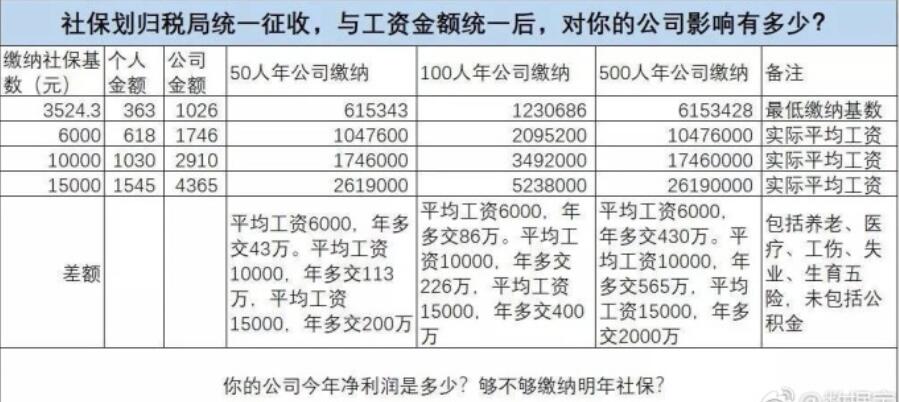 而在2018 7?0日,中办、国办印发了《国税地税征管体制改革方案》。《方案》规定,?019??日起,各项社保交由税务部门统一征收。而在此前,税务部门征收个税,人社部门征收社保费,为企业给职工少缴工资留下“操作空间” 据国泰君安估算,社保改由税务局征收后,企业与个人将补缴共计?万亿元、br/>