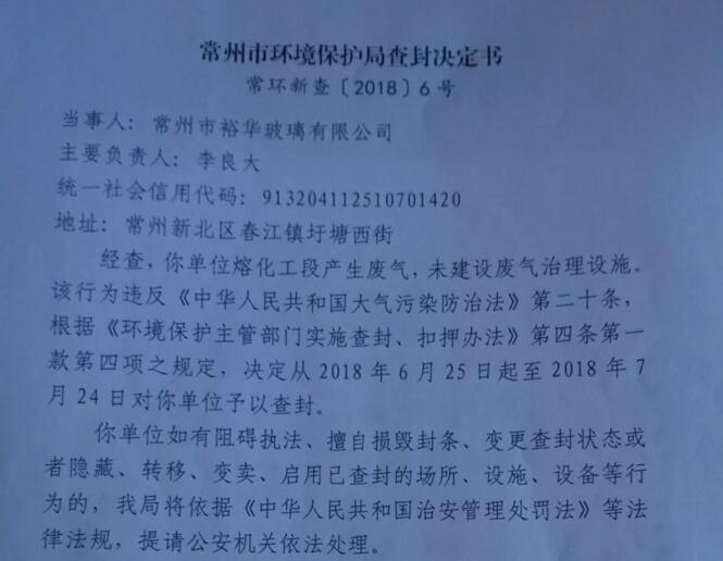而该玻璃厂的关停,是缘于常州市环保局开出的一份查封决定书,书面显示:裕华玻璃厂熔化工段产生废气,未建设废气治理设备,违反了《大气污染防治法》第二十杠/strong>,根据有关规定,决定?018??5日起?018??4日予以查封、br/>