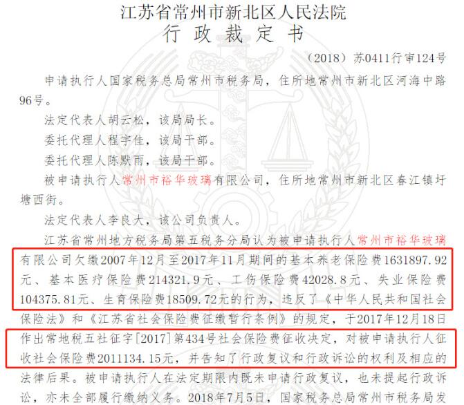中国粉体网讯8?3日,江苏省常州市新北区人民法院发布行政裁定书显示,常州市裕华玻璃有限公司2007?2月至2017?1月期间欠缴基本养老保险费、基本医疗保险费、工伤保险费、失业保险费、生育保险费合计2011134.15元。江苏省常州地方税务局第五税务分局作出社会保险费征收决定,对裕华玻璃公司征收社会保险费。在征收决定生效后,因该公司未全部履行缴纳义务,税务机关向法院申请强制执行、br/>
