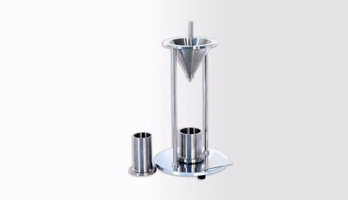 将测量量筒放到平台上,将平台调至水平,将阻塞棒插到漏斗中以堵住流出口,并保证阻塞棒处于直立状态。将待测粉体装满盛样量筒后全部倒入漏斗中,然后拔出阻塞棒,使粉体通过漏斗流出口流到测量量筒中,当粉体全部流出后取出测量量筒,用刮板刮平后放到天平上称量、/p>