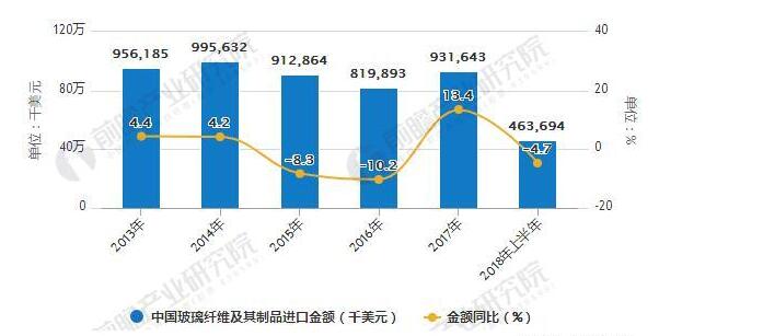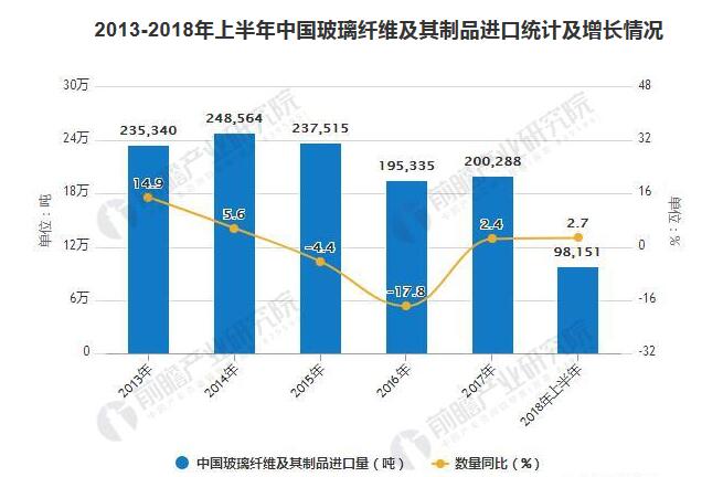 据《玻璃纤维行业产销需求与投资预测研究报告》统计数据显示,2014?2016年我国玻璃纤维及其制品进口量逐渐下降?016年我国玻璃纤维及其制品进口量?95335吨,同比下降17.8%?017年我国玻璃纤维及其制品进口量有小幅度增长?017年我国玻璃纤维及其制品进口量?00288吨,同比增长2.4%?018年上半年我国玻璃纤维及其制品进口数量?8151吨,同比增长2.7%、br/>