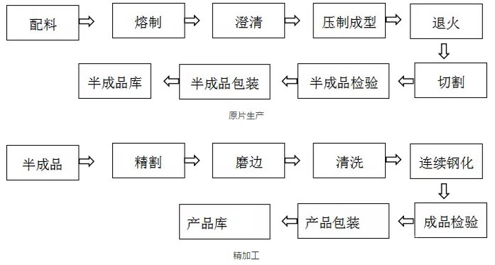 1、压延超白玻璃工艺流程主要包括原片生产和精加工: