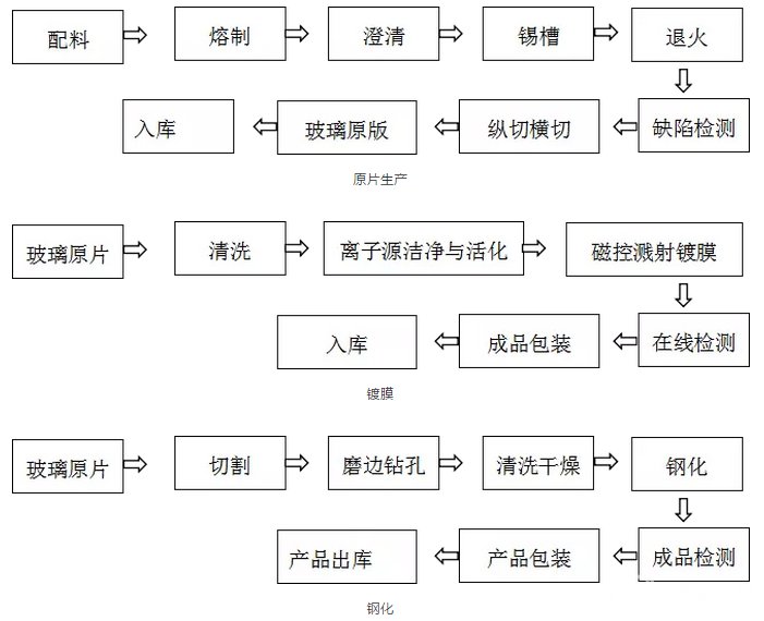 2、浮法超白玻璃工艺流程主要包括原片生产、镀膜、钢化: