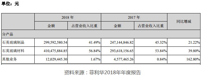 菲利华年度报告显示,公司主要从事新材料产品及装备的技术开发、技术转让、技术咨询、技术服务;石英材料、玻璃材料、特种纤维材料、复合材料及制品的制造与销售。其产品广泛用于半导体、光通讯、光学、航空航天等领域?018年,公司石英玻璃制品、石英玻璃材料、其他业务收入分?9,959.26万元?1,047.59万元?,202.94万元,占营业收入比重?1.49%?6.84%?.67%。详情如下: