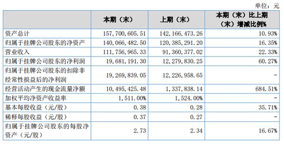 凯德石英(835179)??9日发?2018年度)业绩报告,公司营业总收?11,756,965.33元,比去年同?91,360,377.02)增长22.33%,归属于挂牌公司股东的净利润19,681,191.30元,比去年同?2,279,830.25元增?0.27%,基本每股收??每股)?.38元,比去年同?0.28)元增?5.71%、/p>